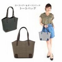 高級素材として知られているホースヘアー&オーストリッチを使用したハンドバッグ。ホースヘアーは上品な光沢となめらかな風合いが特徴です。一頭の馬から約5mしか生地として取れない天然素材なので希少価値も高く、熱や摩擦に強く傷がつきにくい素材です。こちらのバッグは希少な素材、ホースヘアーを縦に織り、横織りの生地はナイロンを使用しています。前面にはポイントとしてオーストリッチを部分使いしています。 【素材】 表面:ホースヘアー(横糸ナイロン)、(前面一部分にオーストリッチ) 底面、ハンドル部分:牛革 中面:布 金具:シルバーカラー 【サイズ】高さ:26cm/横幅:(底)26cm/マチ:12cm/ハンドル高さ:21cm/重量:500g 【開閉】ファスナー開閉 【仕様】 ■メインの収納は1パート ■内側/ファスナーポケット×1、オープンポケット×2 ■外側・あおりポケット×2 背面ファスナーポケット×1 【特長】 ■底の四隅に鋲が打ってあるので、置いた時に底が汚れにくくなっています。 ■長め…