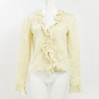 軽快な風合いが魅力のリネントップス☆ フロントと袖のフリルがフェミニンな雰囲気! 胸元はざっくりと開いているので、インナーとの 組み合わせも楽しんでいただけますよ。 幅広デザインに、裾にはゴムがあしらわれていて シルエットも美しく決まります。 着丈約55cm 袖丈約67cm 肩幅約39cm バスト約92cm 【サイズ】:(2) 【素 材】:(麻 100%) 【 色 】:(オフ白) 【程 度】:(A) 20111024-003 388 013