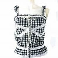 セシルマクビーの黒×白チェックキャミです。 キラキラしたストーンのボタンが可愛い♪ たくさんのレースで飾られたデザインが、女性の心をくすぐります★ 肩ひも部分にはゴムがついていて、伸縮性があります♪ バスト約70cm 着丈約37cm(肩ひも含まない) 【サイズ】:(M) 【素 材】:(綿100%/サテンリボン部分ポリエステル100%) 【 色 】:(黒×白) 【程 度】:(A) **管理番号** 8360-20070219-028 499 029